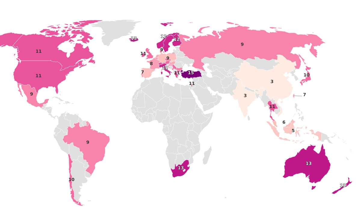 | Turkey | 15 | 12.9K | 21.3 |