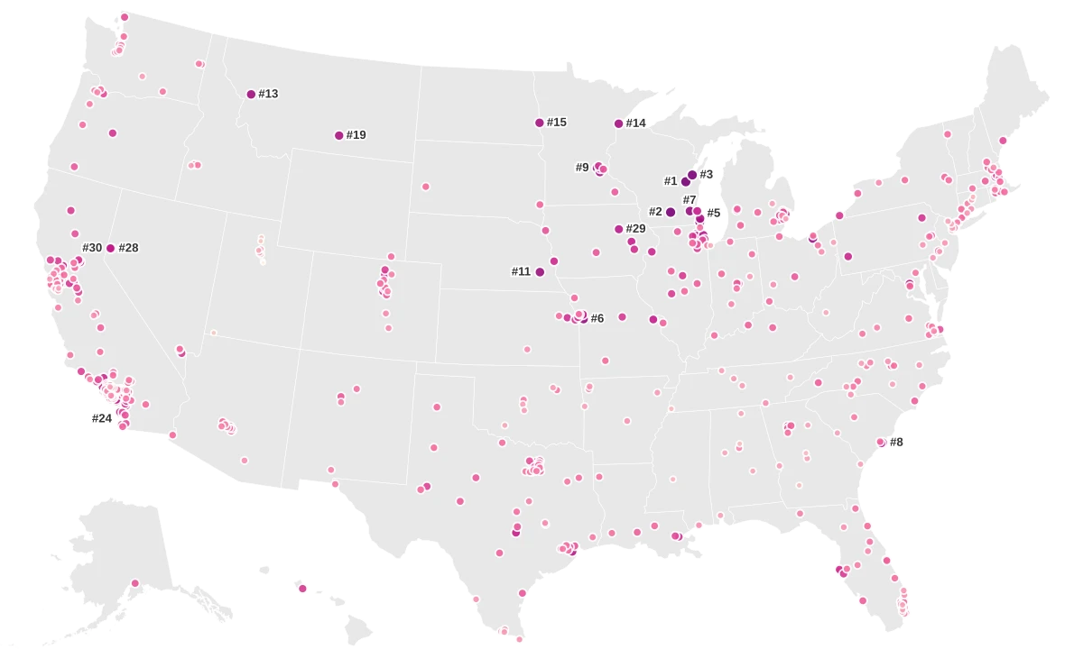 Green Bay and Arlington Heights, Illinois are tied right behind at 25.0%. Kenosha sits at 24.4%. Waukesha hits 23.7%. All seven Wisconsin cities in the dataset fall in the top 20% of the ranking. No other state comes close to that kind of statewide dominance.