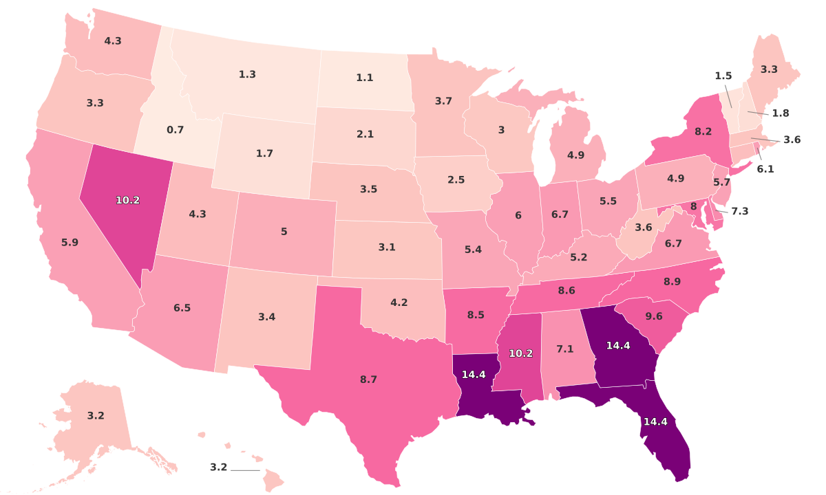 - The Southern States show a significantly higher rate of HIV diagnoses. Georgia leads the pack with a rate of 26.2 per 100k, followed by Louisiana (23.3), Florida (21.7), and Mississippi (17.0).