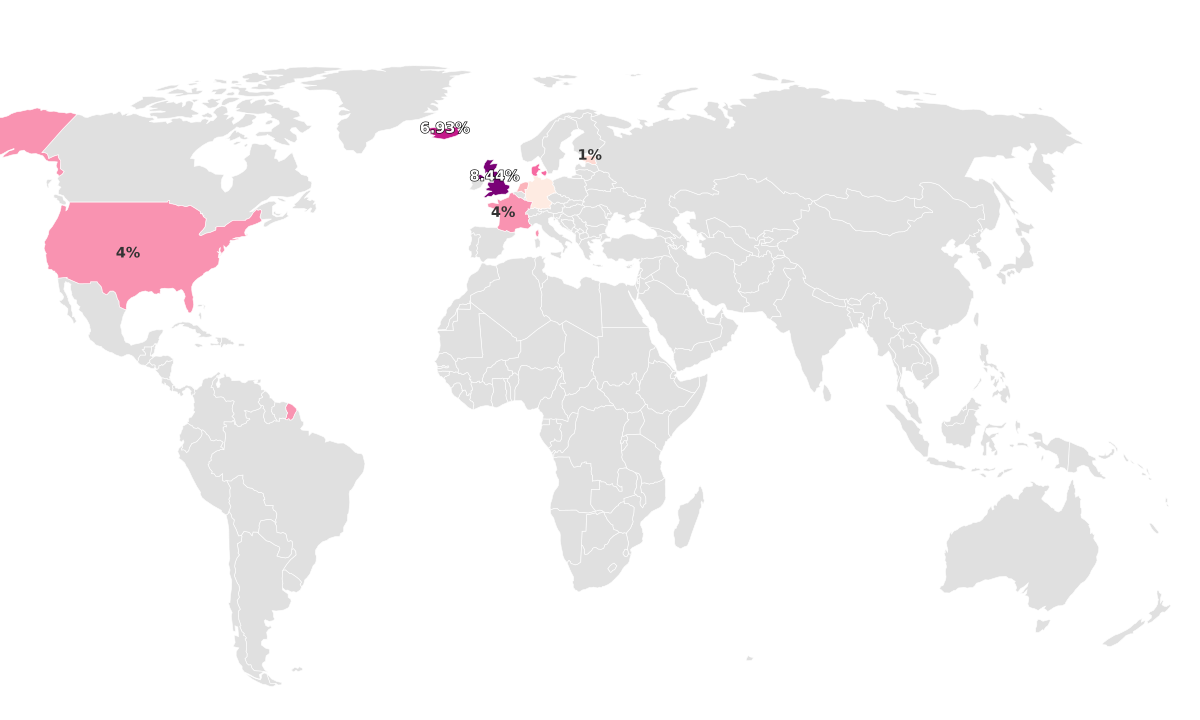 Following closely behind is the United Kingdom, hosting 8.5% of its populace with naturally red-hued tresses. This relatively high frequency could be correlated with the region's frequently overcast weather, which matches redheads' heightened sensitivity to sunlight and their bodies' enhanced ability to generate vitamin D.