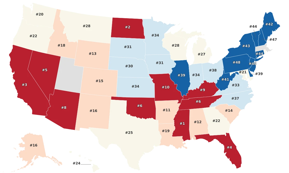 - North Dakota nearly caught up with Mississippi, scoring a staggering 91.3. California, notorious for its busy roads and aggressive driving, secured the third spot with a score of 90.58.